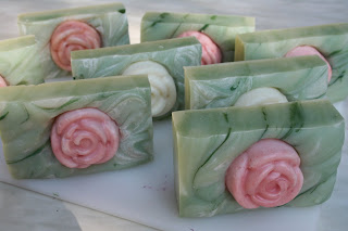 Farbabstufungen gegossen, sowie eine dünne Spur ungefärbten Seifenleim. Die inneren Werte sind: Kokosöl, Palmöl, Maiskeimöl, Mandelö, Sesamöl, Jojobaöl, sowie Sheabutter.Die kleinen Röschen hab ich vom Seifenleim der Rosetta gegossen. Das war auch der Grund, warum ich die Rosetta nicht mehr marmorieren konnte, ich braucht einfach zum Förmchengießen zu viel Zeit, inzwischen fing Rosetta an zu schmollen.
